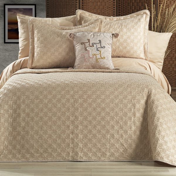 Cuvertura Brodata cu Catifea Aria + 3 Fete de Perna, Pat 2 Persoane – Bej – PUF185927