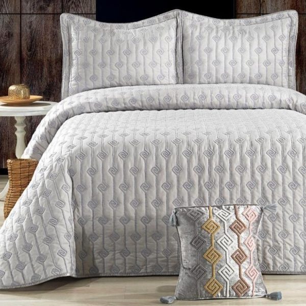 Cuvertura Brodata cu Catifea Lori + 3 Fete de Perna, Pat 2 Persoane – Gri – PUF76268