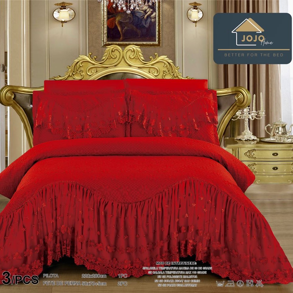 Cuvertura de Lux cu Volanase, 3 Piese, Bumbac Finet, Rosu – JoJo Home – PUF70900