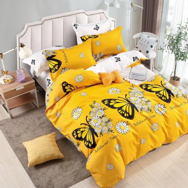 Set Lenjerie de pat din Finet Gros, Cearceaf cu elastic, 6 Piese, Pat 2 Persoane Yellow Butterflies – Jo Jo Design – PUF28435