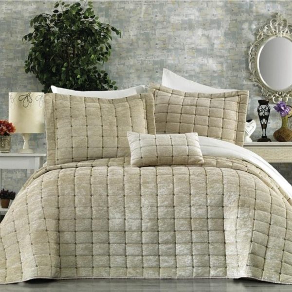 Cuvertura de Pat de Lux Laila, Model Brodat din Catifea, Uni, 250x260cm, 4 Piese – Bej – PUF49328