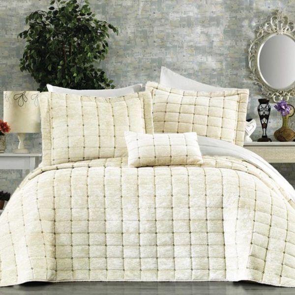 Cuvertura de Pat de Lux Laila, Model Brodat din Catifea, Uni, 250x260cm, 4 Piese – Crem – PUF49331