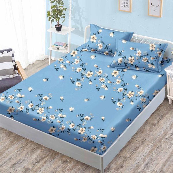 Husa de pat cu elastic din Bumbac Finet 140×200 cm + 2 Fete de Perna, Pat 2 Persoane Flori Albe – Sky Home – PUF24123
