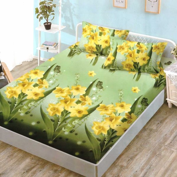 Husa de pat cu elastic din Bumbac Finet 140×200 cm + 2 Fete de Perna, Pat 2 Persoane Verde cu Flori – Sky Home – PUF24125