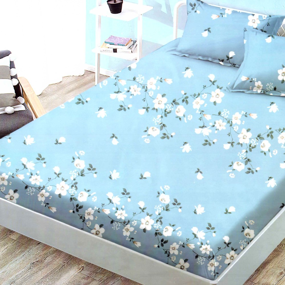 Husa de pat cu elastic din Bumbac Finet + 2 Fete de Perna, Pat 2 Persoane, Bleu cu Flori – Sky Home – PUF66025