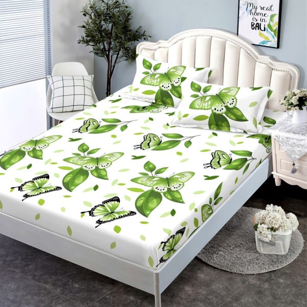 Husa de Pat cu Elastic din Finet + 2 Fete de Perna, 160x200cm, Alba cu Fluturi Verzi – Sky Home – PUF175413