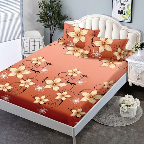 Husa de Pat cu Elastic din Finet + 2 Fete de Perna, 160x200cm, Flori Portocalii – Sky Home – PUF175391