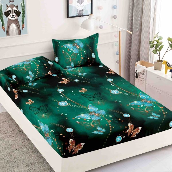 Husa de Pat cu Elastic din Finet + 2 Fete de Perna, Pat 1 Persoana, Smarald Butterflies – JoJo Home – PUF40243