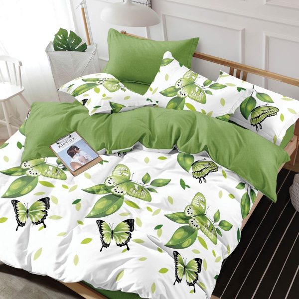 Lenjerie de Pat din Finet, 4 Piese, Pat 1 Persoana Alba cu Fluturi Verzi – Super Elegant Pucioasa – PUF184834