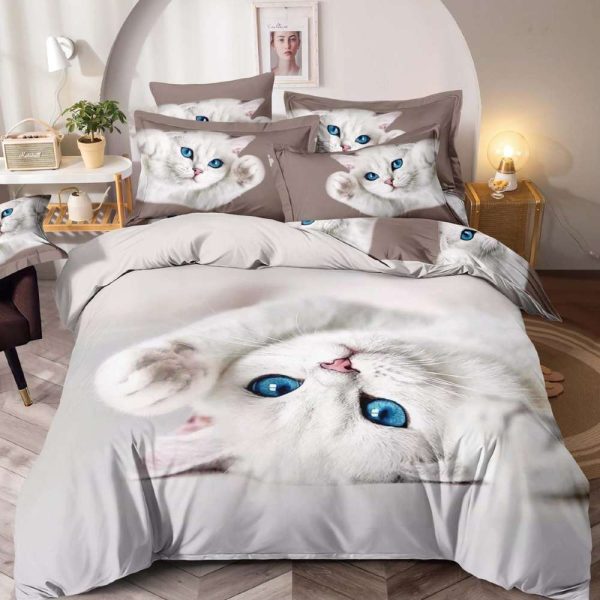 Set Lenjerie de Pat Dublu, Bumbac Finet Superior, 2 Fete, 6 Piese – Blue Eyes Cat – PUF26847