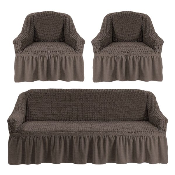 Set 3 Huse Elastice pentru Canapea de 3 Locuri + 2 Fotolii, Model Creponat – Cafeniu – PUF19936-202