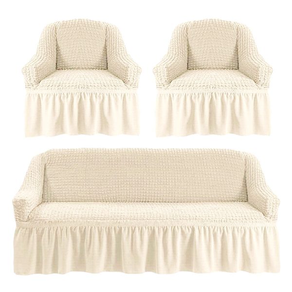 Set 3 Huse Elastice pentru Canapea de 3 Locuri + 2 Fotolii, Model Creponat – Crem – PUF17883-214