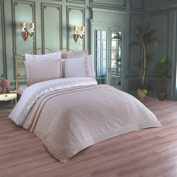 Set 9 Piese: Cuvertura de Lux + Lenjerie Bumbac 100% Poplin cu Broderie, Pat 2 Persoane – Jado Leaf – Bej