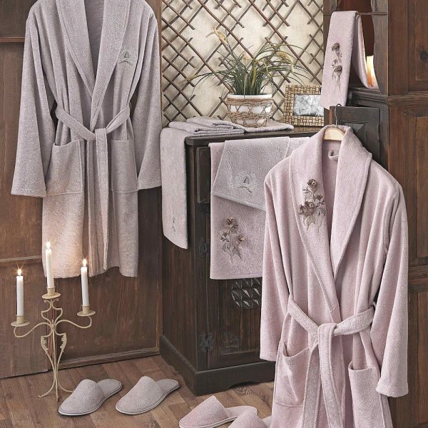 Set Anetta: 2 Halate de Baie + 4 Prosoape + Papuci, Bumbac 100%, Bej & Pudra – Dantela Vita – PUF36411