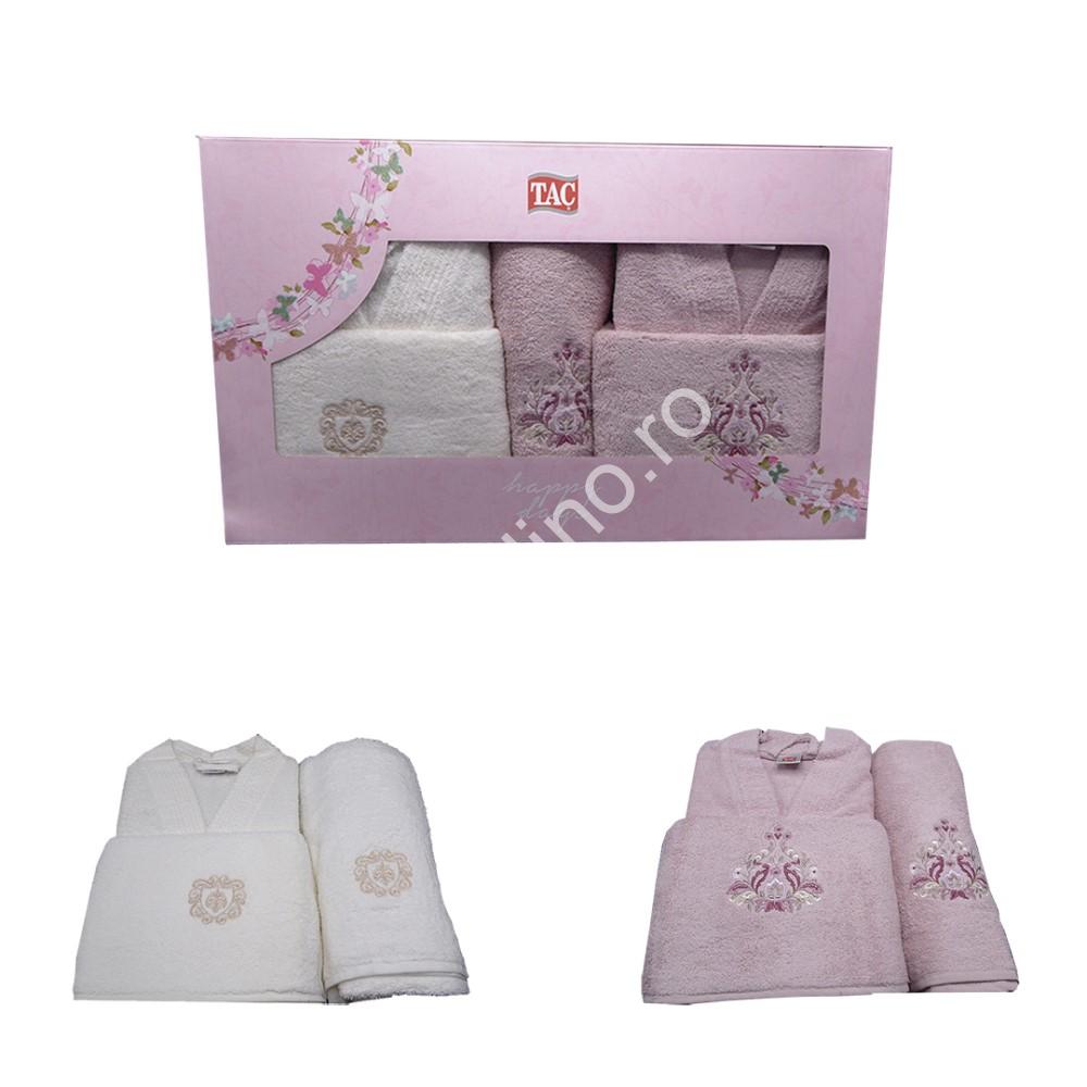Set Cadou 6 Piese: 2 Halate Baie + 2 Prosoape Mici + 2 Prosoape Mari, Bumbac 100%, Alb & Lila - TAC - PUF5228