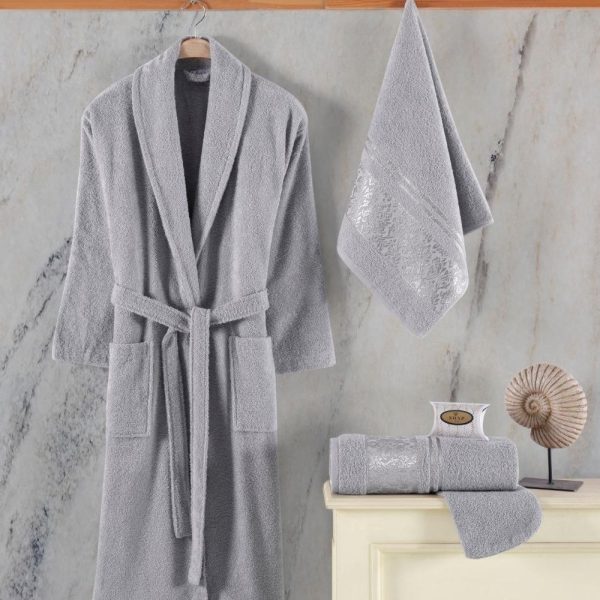 Set Cadou Single: Halat de Baie + Prosoape din Bumbac 100%, 4 Piese, Gri Deschis – Luisa – PUF168397