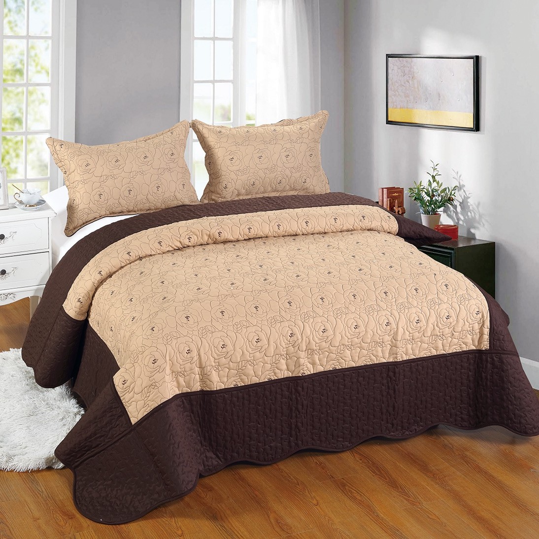 Set Cuvertura de Pat Crem & Maro Inchis, 3 Piese, Pat 2 Persoane, 230×250 Cm – Fashion Casa – PUF13031