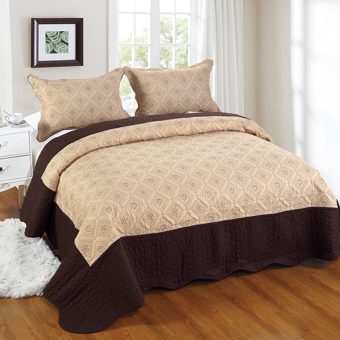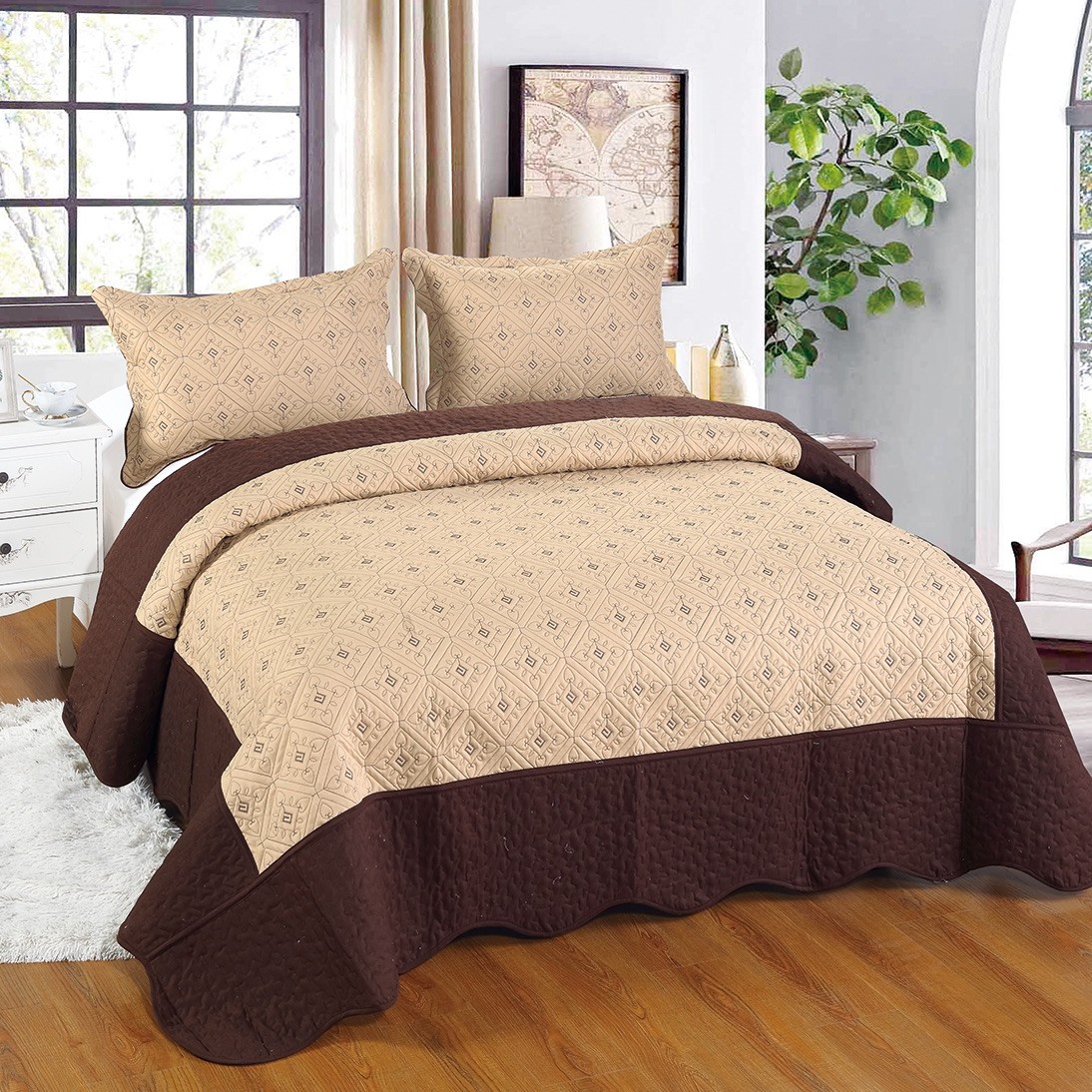 Set Cuvertura de Pat Crem & Maro Inchis, 3 Piese, Pat 2 Persoane, 230×250 Cm - Fashion Casa - PUF13031