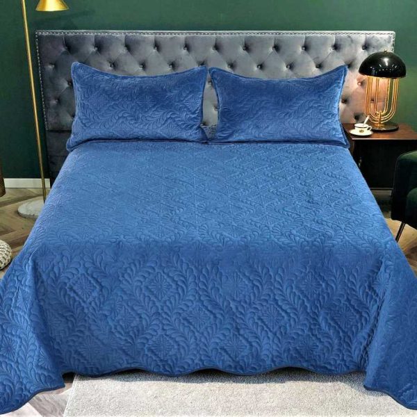Set Cuvertura de Pat din Catifea, Albastru, 3 Piese, Pat 2 Persoane – Casa Pucioasa – PUF18731