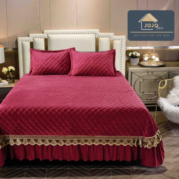 Set Cuvertura de Pat din Catifea cu Broderie, 3 Piese, 230×250cm, JoJo Home – Grena – PUF92726