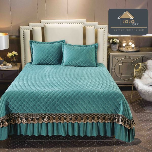 Set Cuvertura de Pat din Catifea cu Broderie, 3 Piese, 230×250cm, JoJo Home – Turcoaz – PUF92713