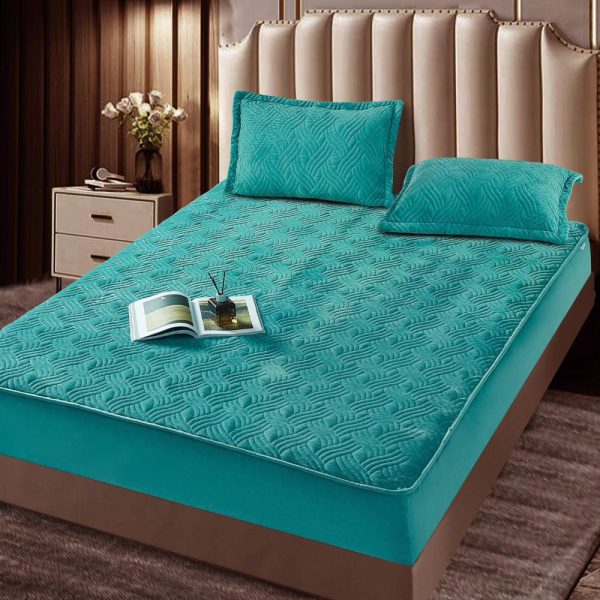 Set Husa de Pat Matlasata Groasa cu Elastic + 2 Fete Perna, Model Topper Catifea, 180x200cm, JoJo Home - Turcoaz - PUF124150