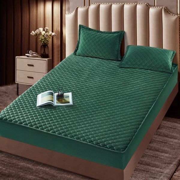 Set Husa de Pat Matlasata Groasa cu Elastic + 2 Fete Perna, Model Topper Catifea, 180x200cm, JoJo Home - Verde - PUF124152