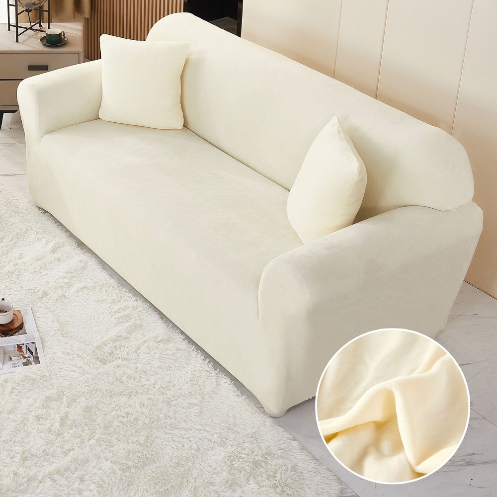 Set Husa Elastica din Catifea pentru Canapea 3 Locuri + Fata de Perna – Crem – PUF73257