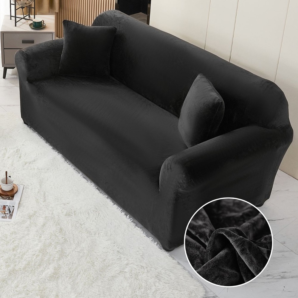 Set Husa Elastica din Catifea pentru Canapea 3 Locuri + Fata de Perna – Negru – PUF73266