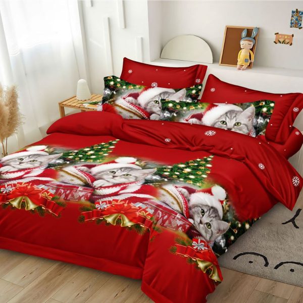 Set Lenjerie de Craciun din Finet Gros, Pucioasa, 6 Piese, Pat 2 Persoane – The New Christmas Cat – PUF128878-F10