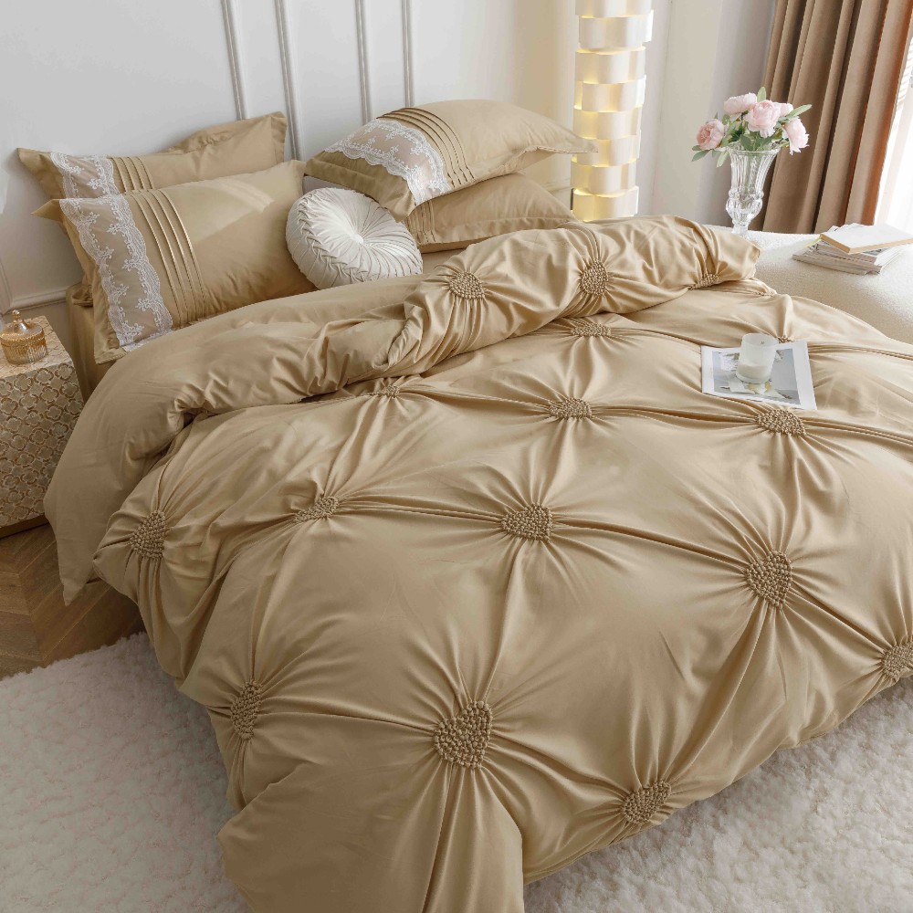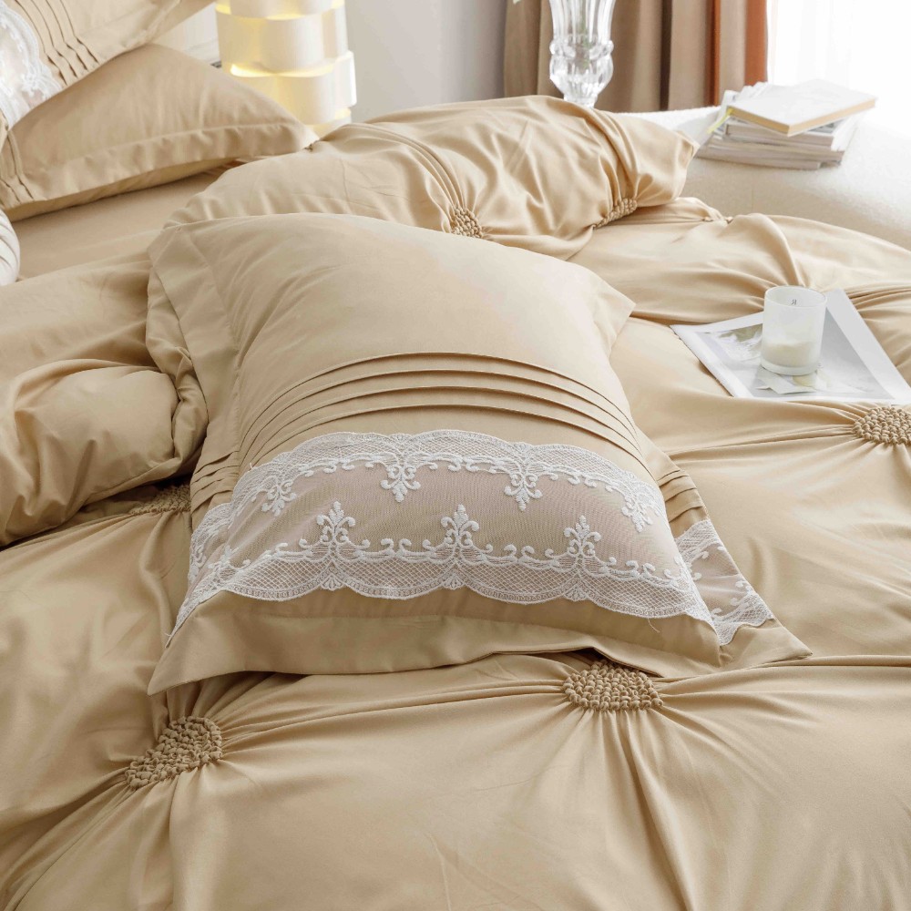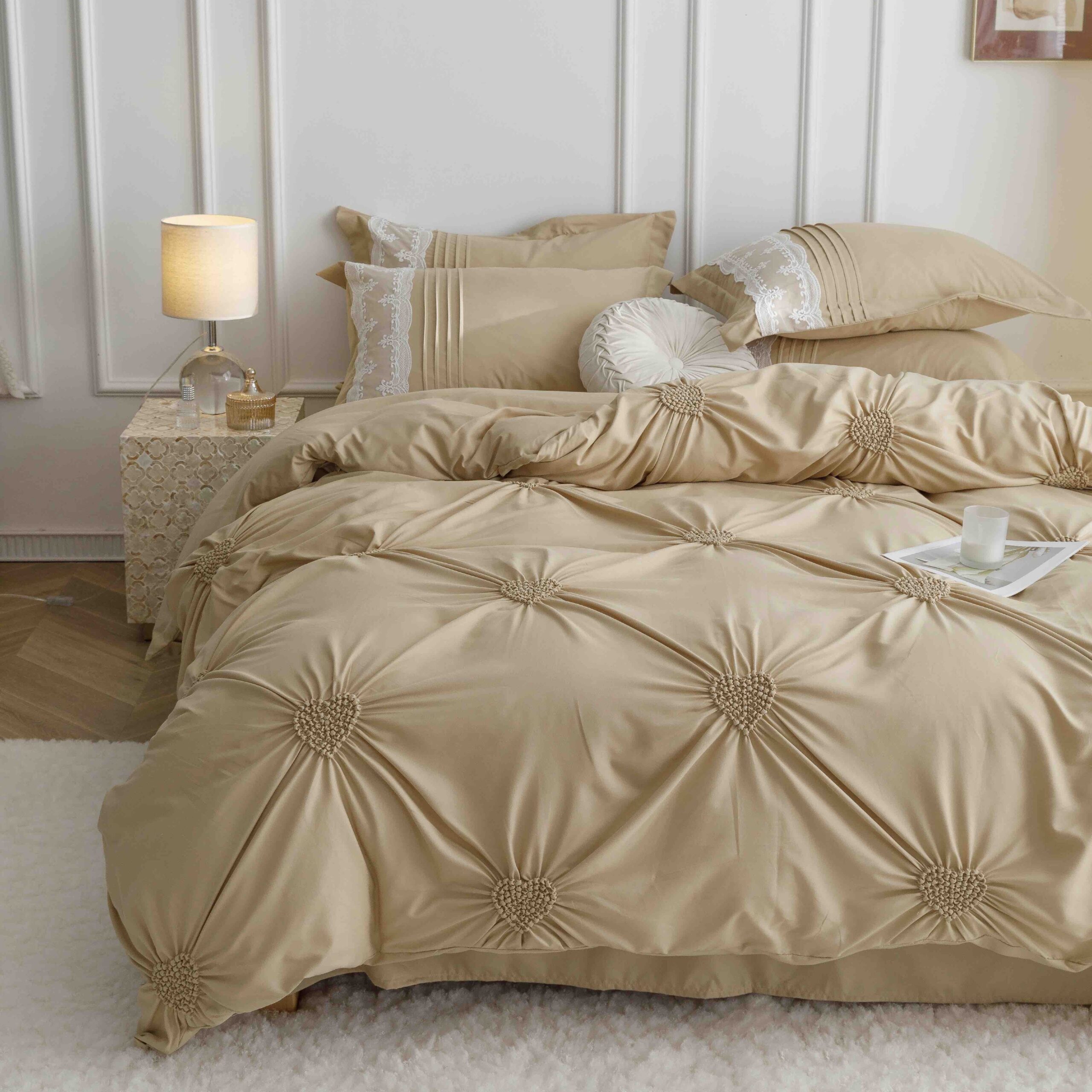 Set Lenjerie de Pat Brodata, Pliuri & Inimioare, Bumbac Soft Touch, 6 Piese, Pat Dublu – Bej – PUF91041