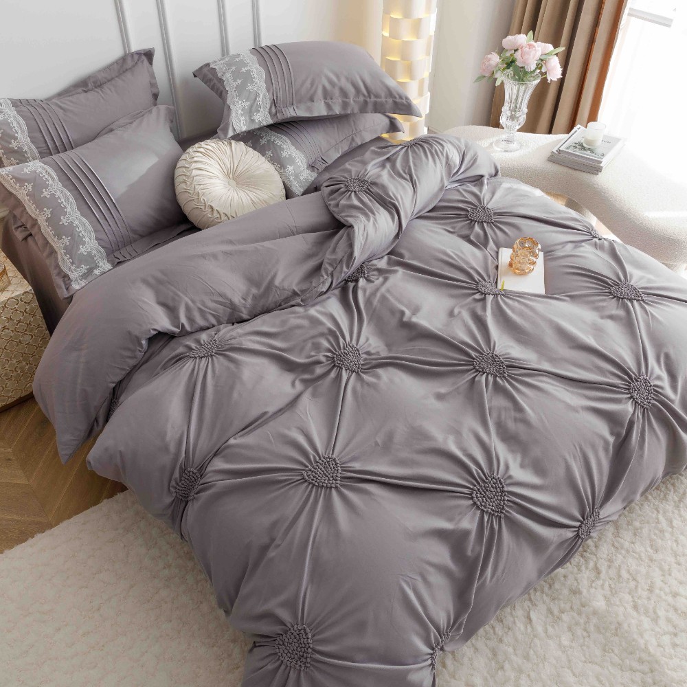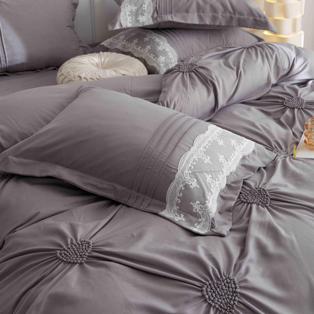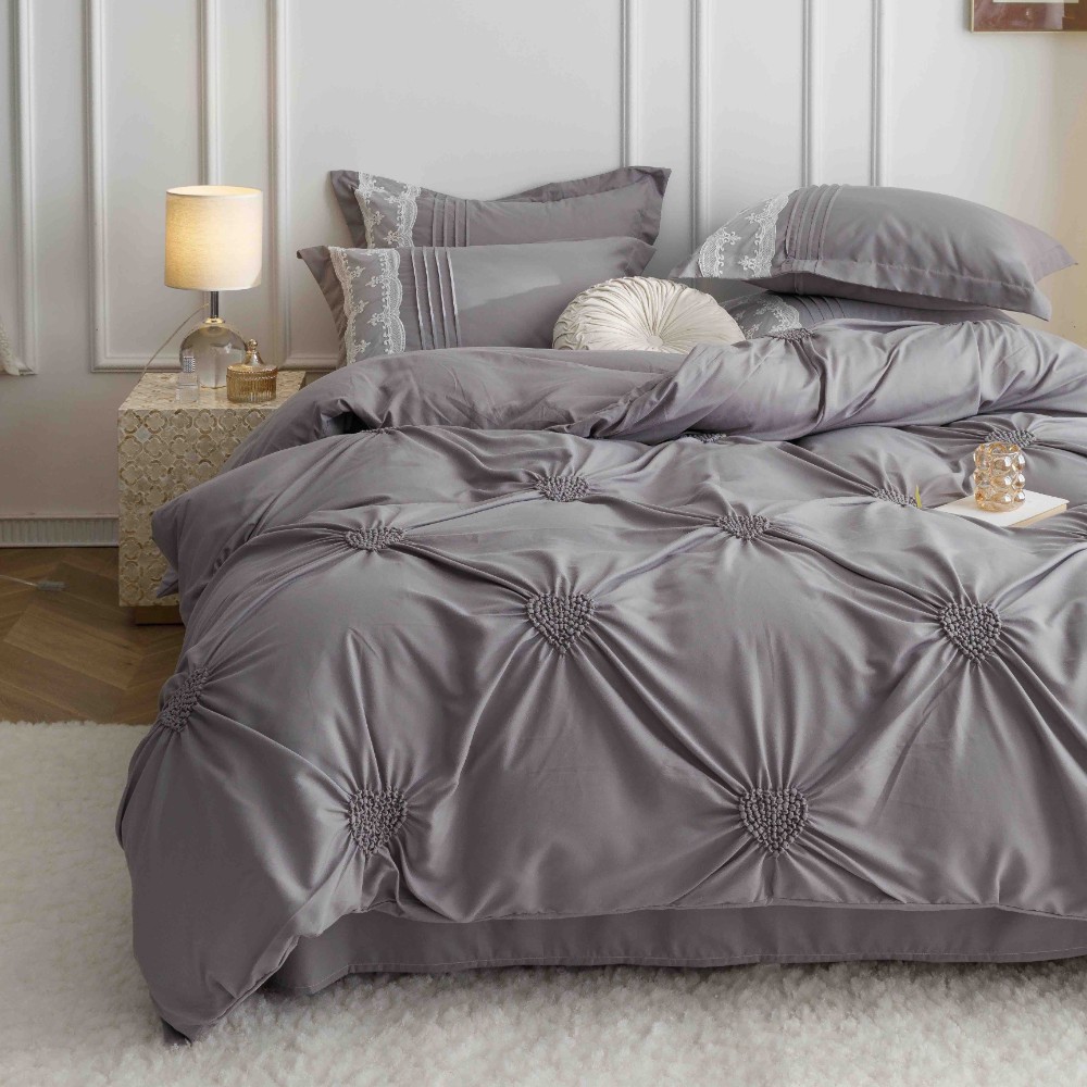 Set Lenjerie de Pat Brodata, Pliuri & Inimioare, Bumbac Soft Touch, 6 Piese, Pat Dublu – Gri Deschis – PUF91046