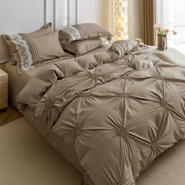 Set Lenjerie de Pat Brodata, Pliuri & Inimioare, Bumbac Soft Touch, 6 Piese, Pat Dublu – Maro – PUF142442