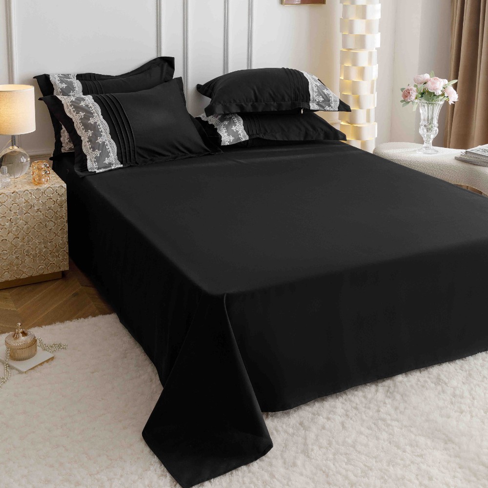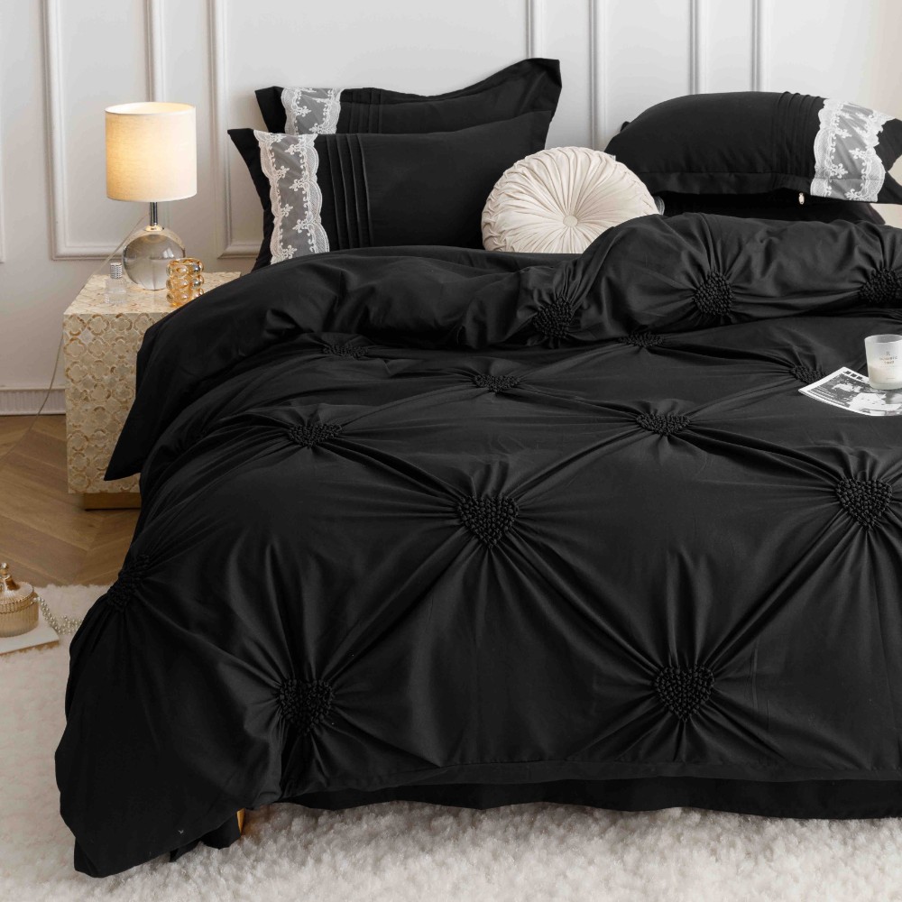 Set Lenjerie de Pat Brodata, Pliuri & Inimioare, Bumbac Soft Touch, 6 Piese, Pat Dublu – Negru – PUF91053