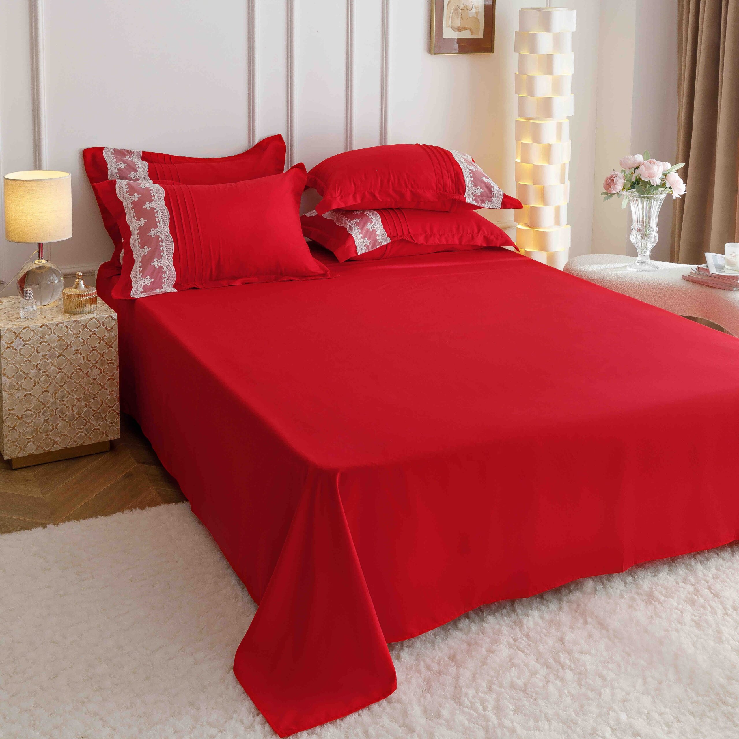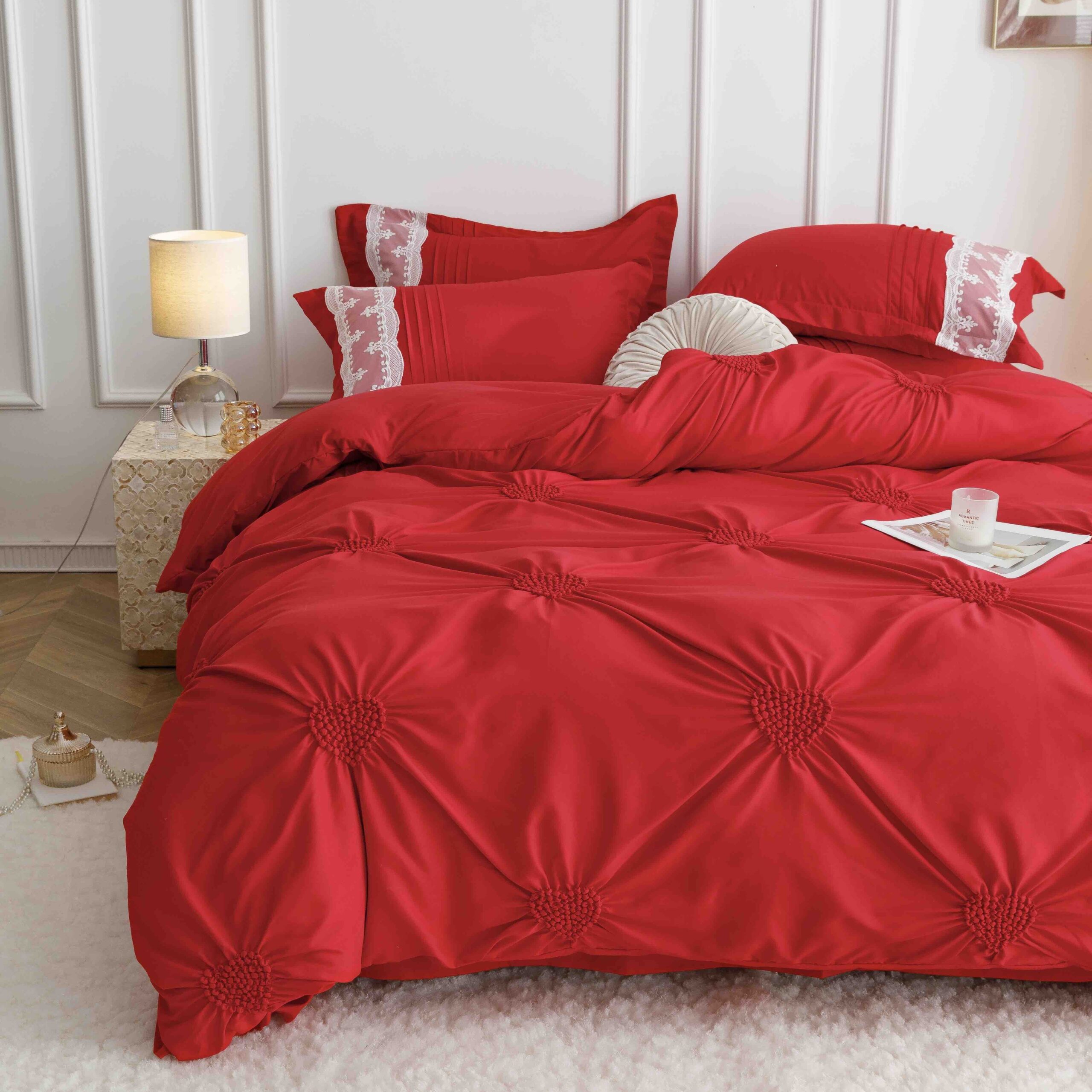 Set Lenjerie de Pat Brodata, Pliuri & Inimioare, Bumbac Soft Touch, 6 Piese, Pat Dublu - Rosu - PUF91054