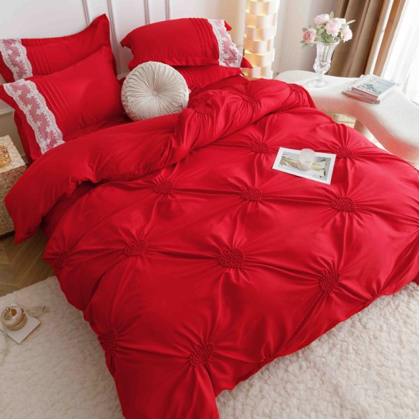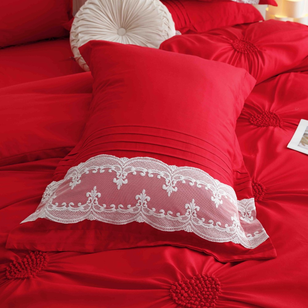 Set Lenjerie de Pat Brodata, Pliuri & Inimioare, Bumbac Soft Touch, 6 Piese, Pat Dublu – Rosu – PUF91054