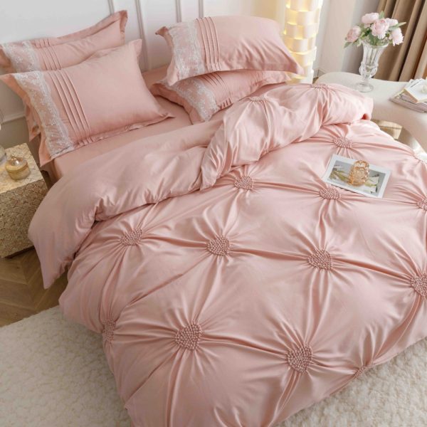 Set Lenjerie de Pat Brodata, Pliuri & Inimioare, Bumbac Soft Touch, 6 Piese, Pat Dublu – Somon – PUF91057