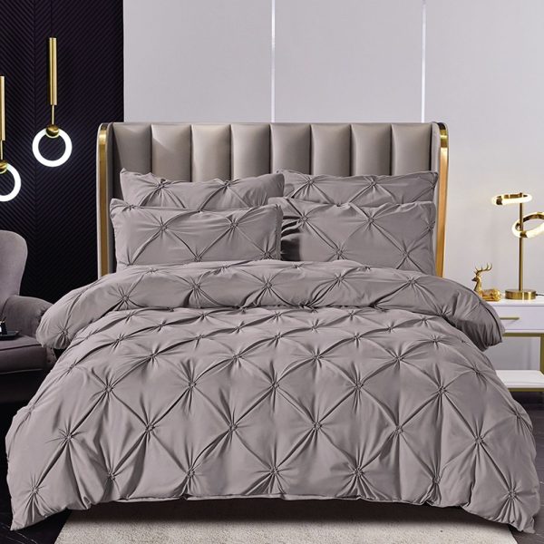 Set Lenjerie Brodata Uni, Model cu Pliuri, Bumbac Finet, 6 Piese, Pat 2 Persoane – Gri Deschis – PUF23987