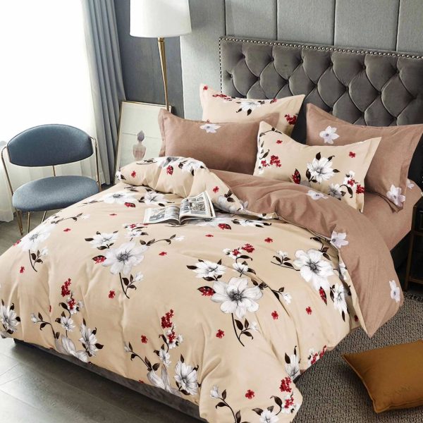 Set Lenjerie de Pat din Finet, Cearceaf cu Elastic, 4 Piese, Pat 2 Persoane, Bej cu Floricele Albe – Sky Home – PUF189765