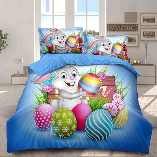 Set Lenjerie Finet Gros, 6 Piese, Pat 2 Persoane, Cearceaf cu Elastic, Model de Paste – Blue Easter – PUF190628-BL6