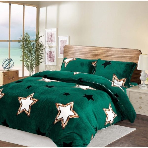 Set Lenjerie Pufoasa Cocolino cu Elastic, Pat 2 Persoane, 4 Piese- Sky Home – Green Stars – PUF174771*