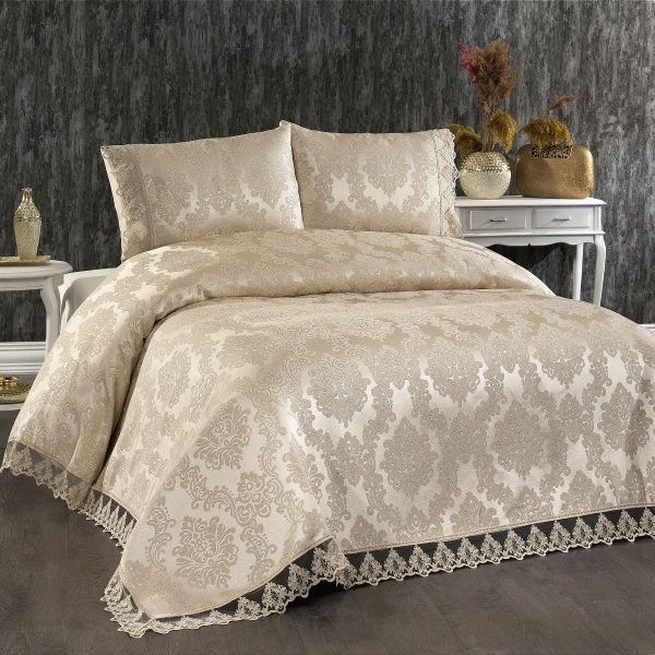 Set Luxury DESPINA: Cuvertura de Pat cu Bordura + 2 Fete de Perna, 240 x 260cm – Bej – PUF123202