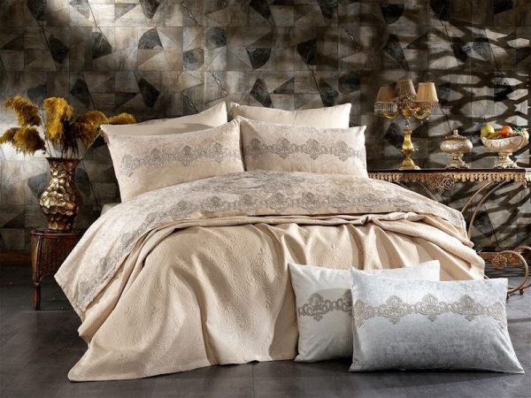 Set Luxury Dream Of Lady: Cuvertura + Lenjerie de Pat, 6 Piese, Pat 2 Persoane, Crem / Bej – PUF108667