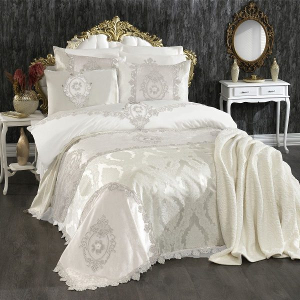 Set Luxury LUCY 6 Piese: Cuvertura, Cearsaf de Pat + 4 Fete de Perna, Pat Matrimonial – Crem – PUF123206