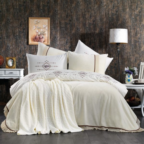 Set Luxury Wellsoft: Lenjerie + Cuvertura + Patura, 8 Piese, Pat 2 Persoane – Alçeyiz Home – Crem – PUF57873