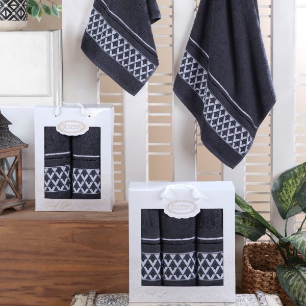 Set Prosoape Premium cu Broderie Tribal, Bumbac 100%, Charcoal Gray – Gulcan Home – PUF153740