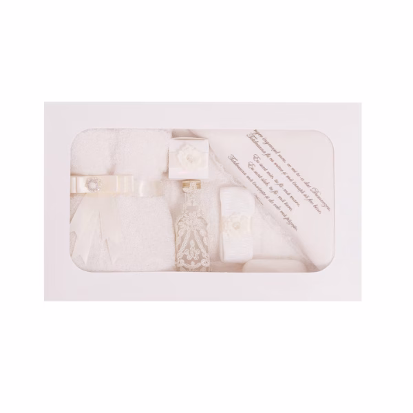 Setul complet contine un prosop pentru bebelus, o fasa de bumbac, un prosop pentru preot, o panza de mir, o sticluta pentru mir, sapunul si cutia pentru prima suvita.